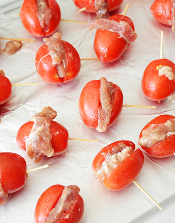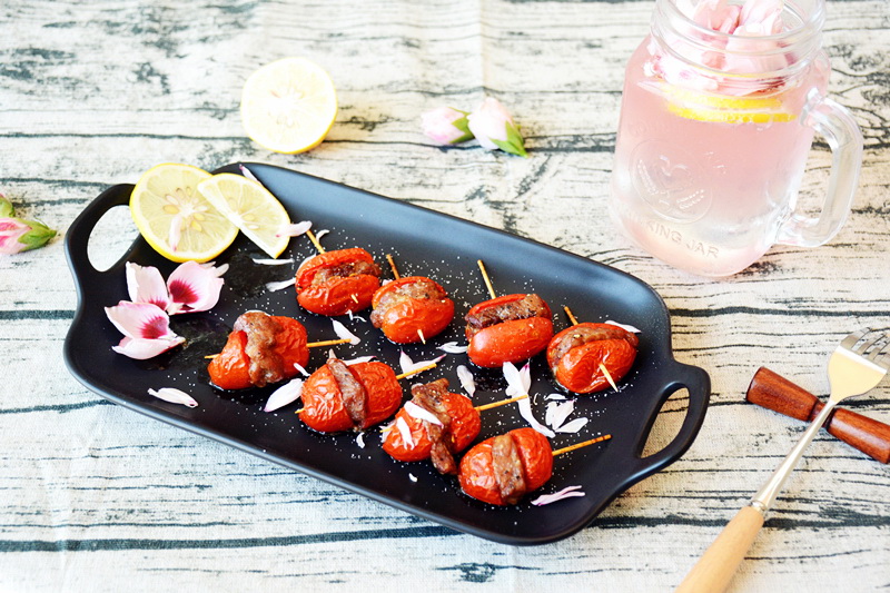 • 材料: 圣農一整塊牛排1包 圣女果20個 黑胡椒粉少許 細鹽少許 橄欖油視情況而定 步驟: 圣女果洗凈,中間切口(不要切斷) 一整塊牛排完全解凍,平均切成20個牛肉丁 將牛肉丁塞入圣女果,用牙簽串好固定 油的錫紙烤盤上擺好,撒上黑胡椒 刷一層橄欖油 放入預熱好的烤箱190度中層上下火烤10分鐘